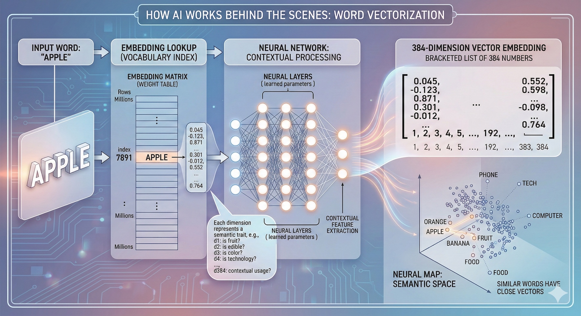 Imagine taking words or data and turning them into numbers – that's called embedding. These numbers form vectors in a high-dimensional space. Similar ideas cluster close together. For example, "apple" might be vector [0.1, 0.5, -0.2], and "banana" [0.1, 0.6, -0.1] – close in fruit space. But if "apple" is near "iPhone," its vector shifts contextually. LLMs use massive neural networks trained on billions of examples to predict the next word or answer questions by calculating probabilities. It's not magic; it's statistics on steroids. We spent hours in TRAE exploring this – generating vector embeddings for sample text and visualizing similarities with cosine distance math. If you're new to this, think of it as a giant recommendation engine for knowledge.